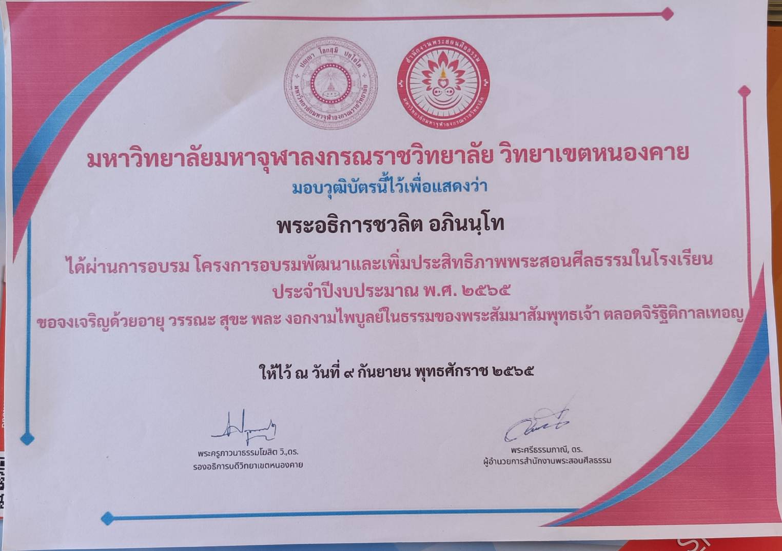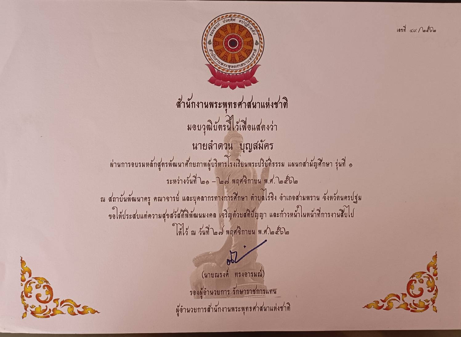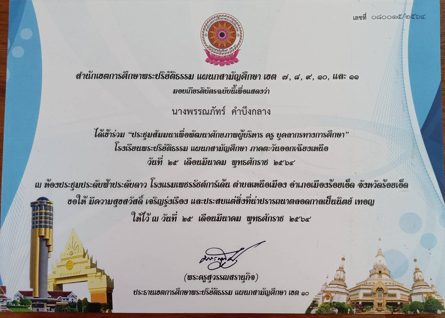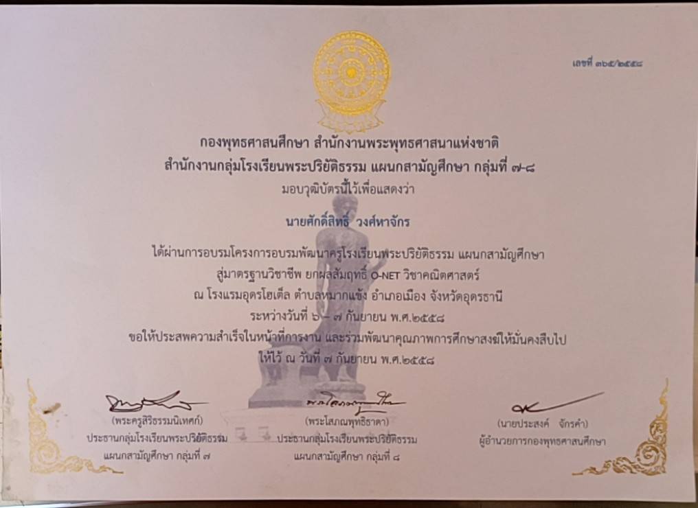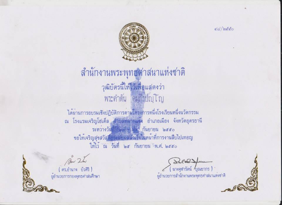 ผ่านการอบรมหลักสูตรพัฒนาศักยภาพผู้บริหารโรงเรียนพระปริยัติธรรม แผลกสามัญศึกษา รุ่นที่ 1